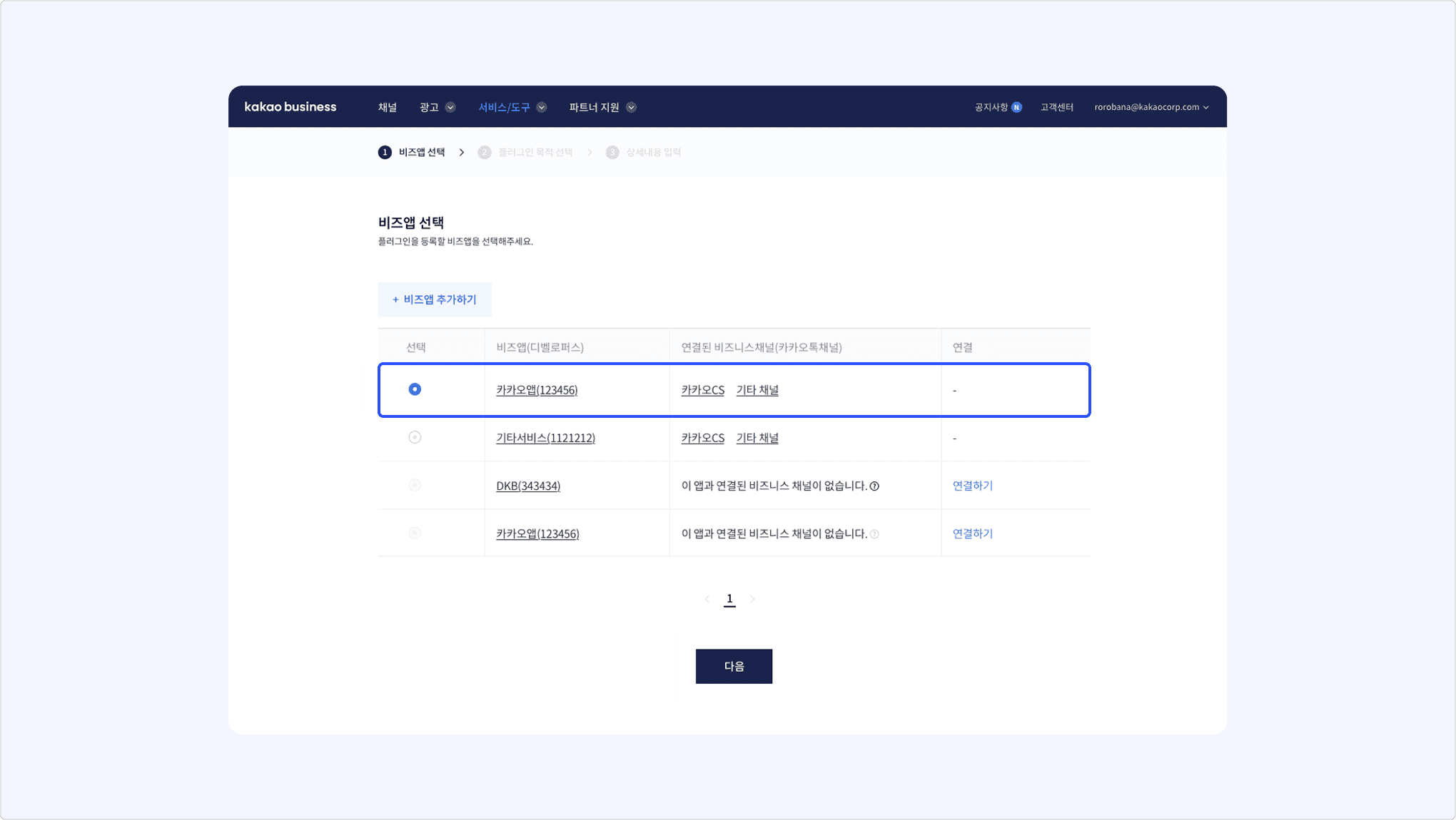 [비즈플러그인 등록하기] 또는 [플러그인 등록]을 클릭하면 아래와 같은 비즈 앱 목록이 나타납니다. 플러그인을 등록할 비즈 앱을 선택하고 [다음]을 클릭합니다.