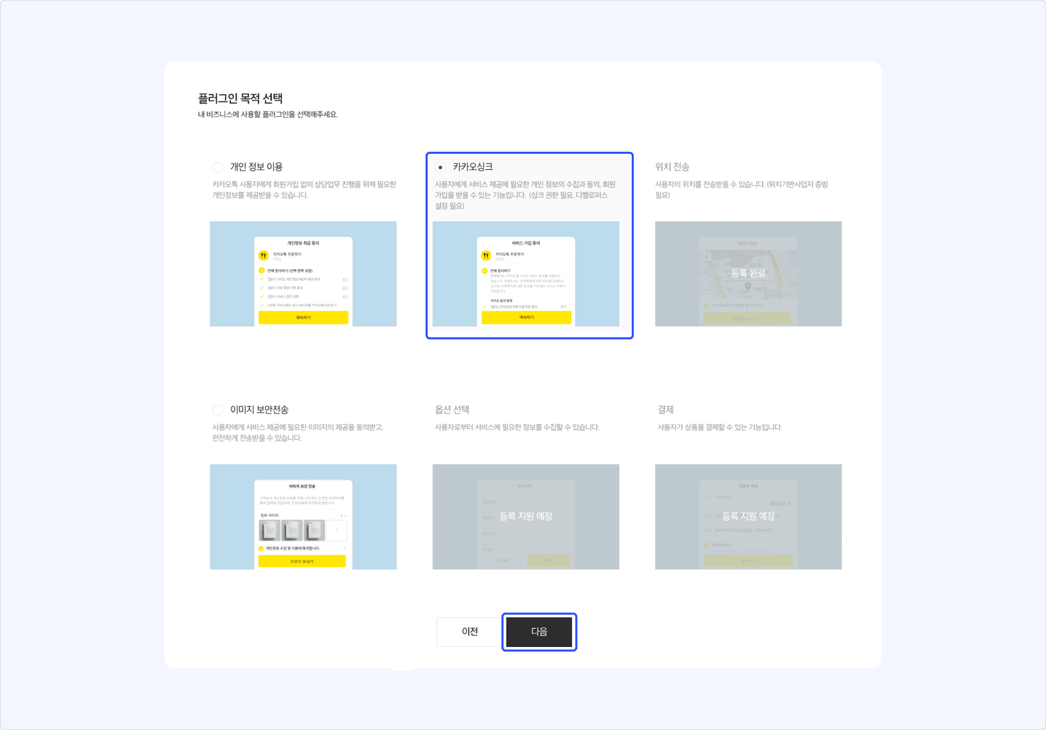 [플러그인 목적 선택] 화면에서 [카카오싱크]를 선택하고 [다음]을 클릭합니다.