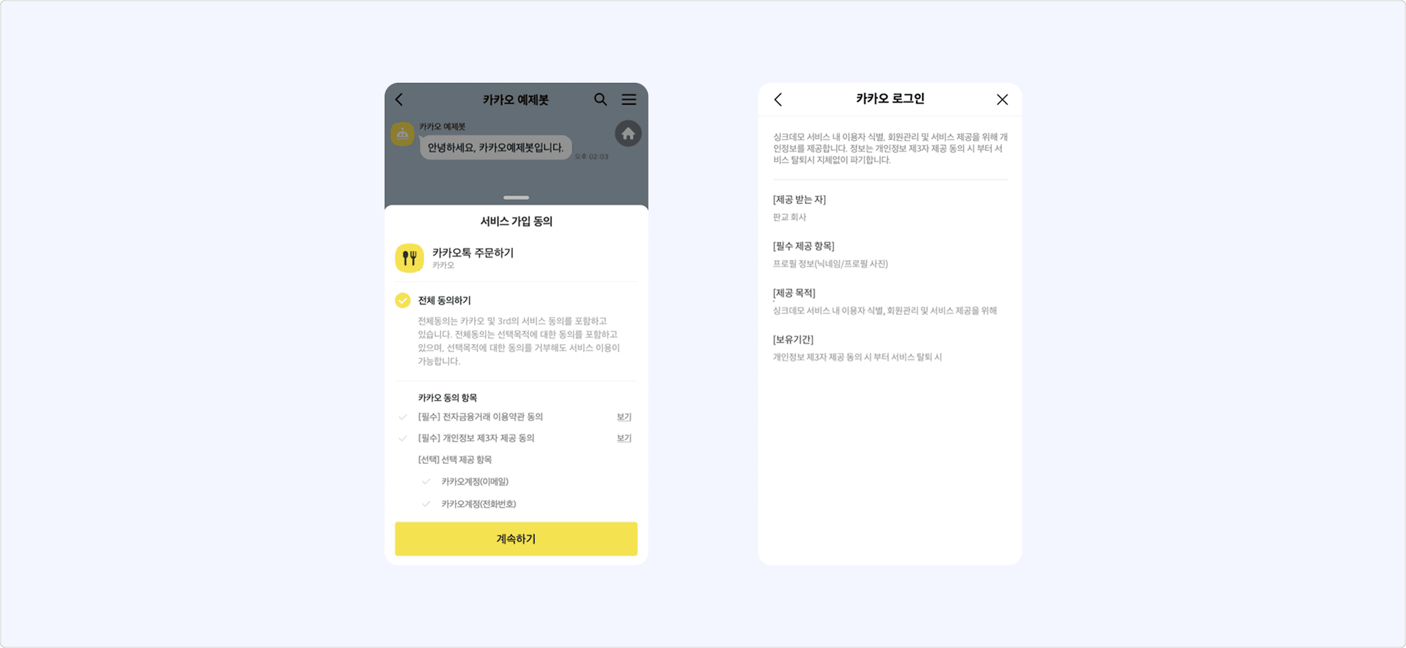 - 사용자가 채팅방에 나타나는 카카오 동의 화면의 내용에 동의합니다.