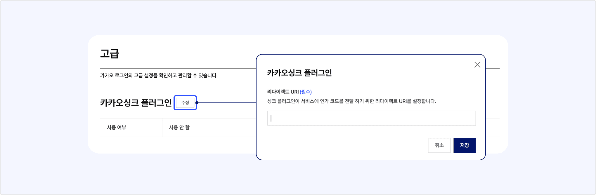 앱 관리 페이지의 [카카오 로그인] > [고급]에서 [수정]을 눌러 리다이렉트 URI를 등록합니다. 이 메뉴에서 설정한 리다이렉트 URI는 [카카오 로그인] 메뉴에서 등록한 것과 별개로, 싱크 플러그인으로 카카오 로그인 요청 시 사용할 싱크 플러그인 redirect_uri입니다.