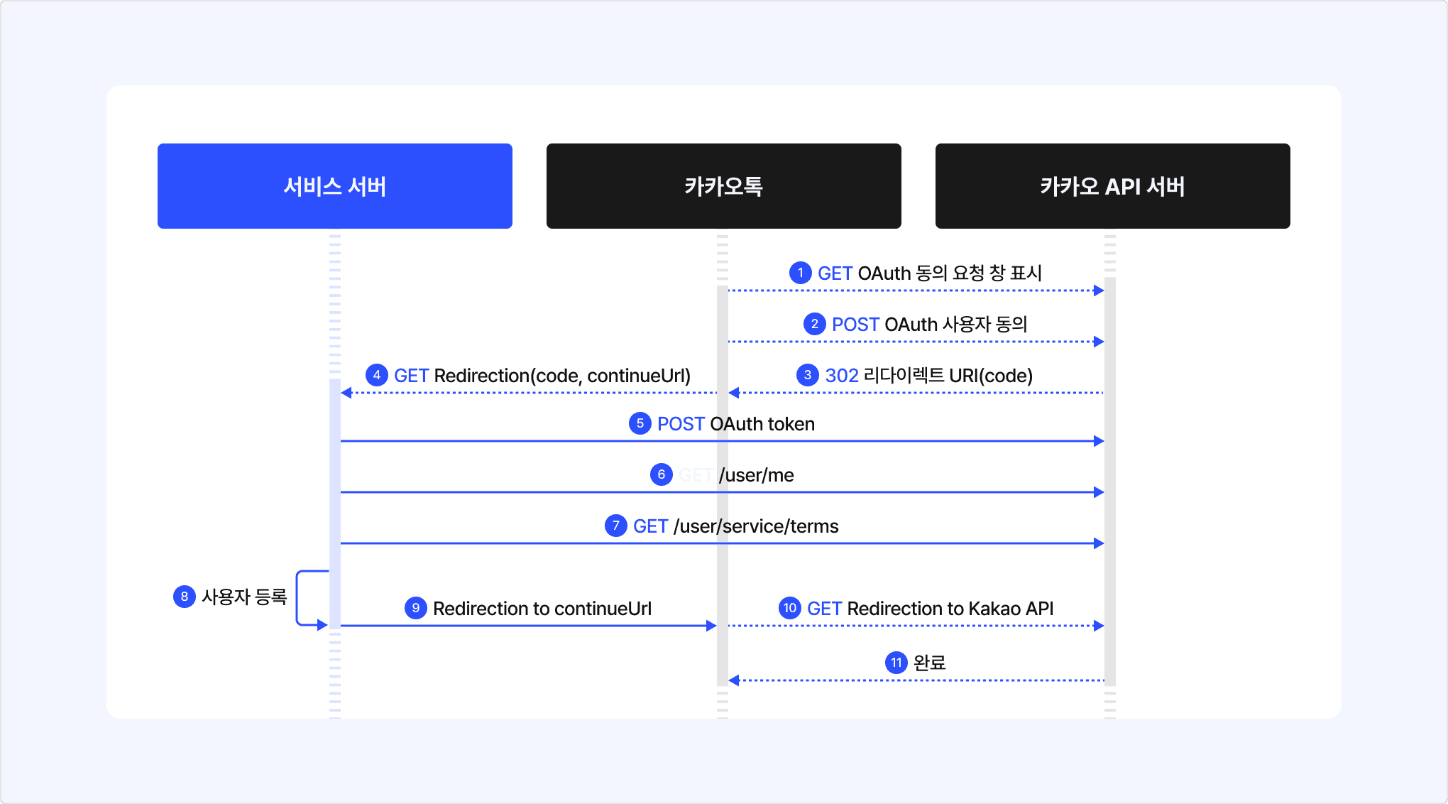 서비스 서버는 발급받은 토큰으로 사용자 정보 조회 요청을 보내 로그인 및 가입에 필요한 사용자 정보를 조회합니다. 또한, 서비스 약관 동의 내역 조회 요청을 보내 사용자가 동의한 서비스 약관 내역을 확인합니다. 이를 기반으로 회원 가입에 필요한 정보를 확보해 가입을 처리하거나, 대화에 필요한 정보를 받을 수 있습니다.