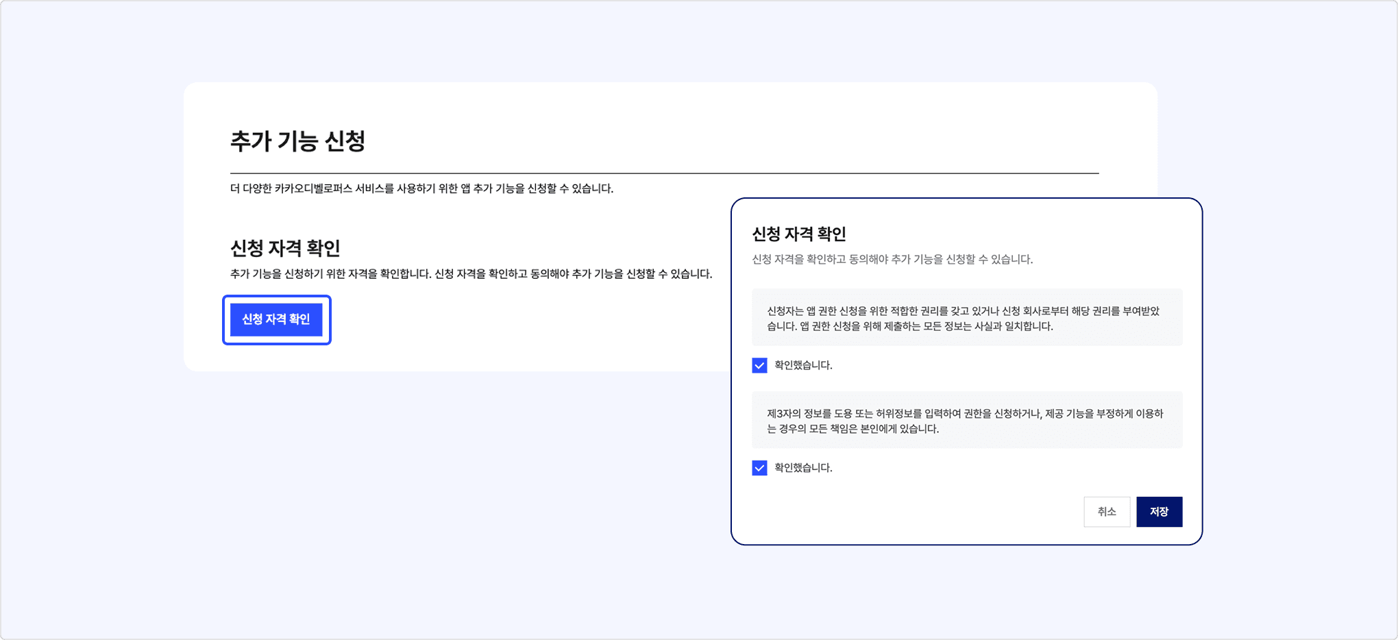 앱의 오너(Owner) 또는 에디터(Editor) 멤버 계정으로 로그인 후, 앱 관리 페이지의 [앱] > [추가 기능 신청]에서 [신청 자격 확인]을 선택합니다. 신청 자격의 내용을 확인한 뒤 동의해야 합니다.