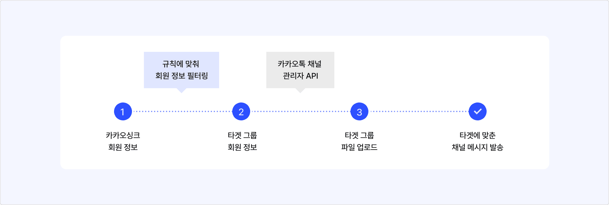 카카오톡 채널 고객 관리 API를 사용해 카카오 로그인 또는 카카오싱크 간편가입으로 확보한 사용자 정보를 기반으로 고객파일을 업로드하면, 카카오톡 채널 파트너센터에서 조건별 친구 그룹을 만들어 세분화된 타깃 메시지를 발송할 수 있습니다. 자세한 내용은 카카오톡 채널 파트너센터 공지사항을 참고합니다.