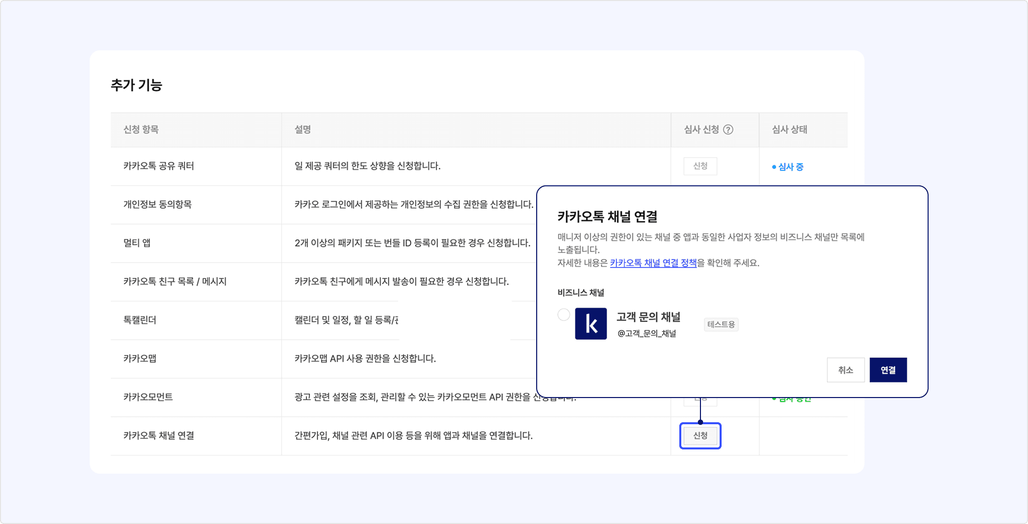 [앱] > [추가 기능 신청] > [추가 기능]에서 [카카오톡 채널 연결] 항목의 [신청]을 선택하면 연결 가능 카카오톡 채널 목록이 표시됩니다. 원하는 채널을 선택하면 앱과 카카오톡 채널이 연결됩니다. 연결한 채널은 연결된 카카오톡 채널에서 확인하고 필요한 경우 연결 해제할 수 있습니다.