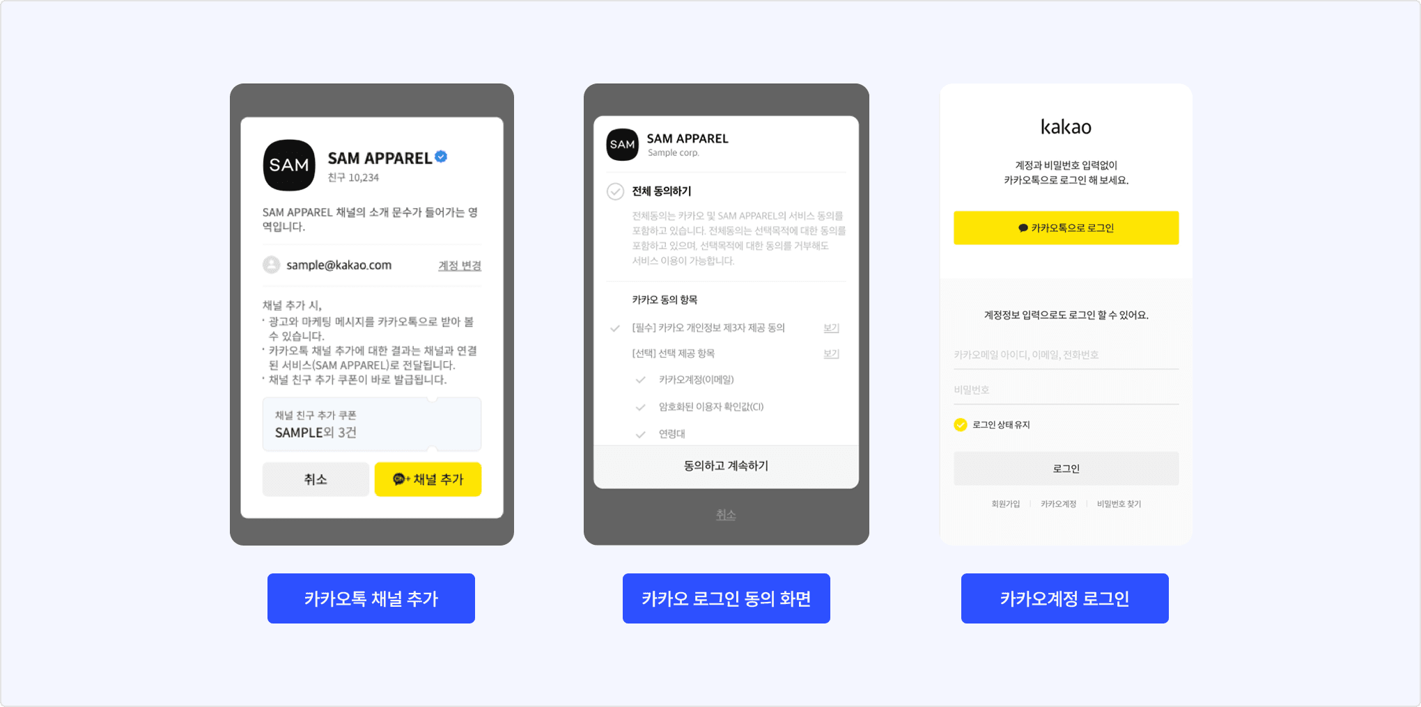 아래 주요 표시 화면과 카카오 로그인 사용 여부에 따른 카카오톡 채널 추가 요청 방법을 참고합니다.