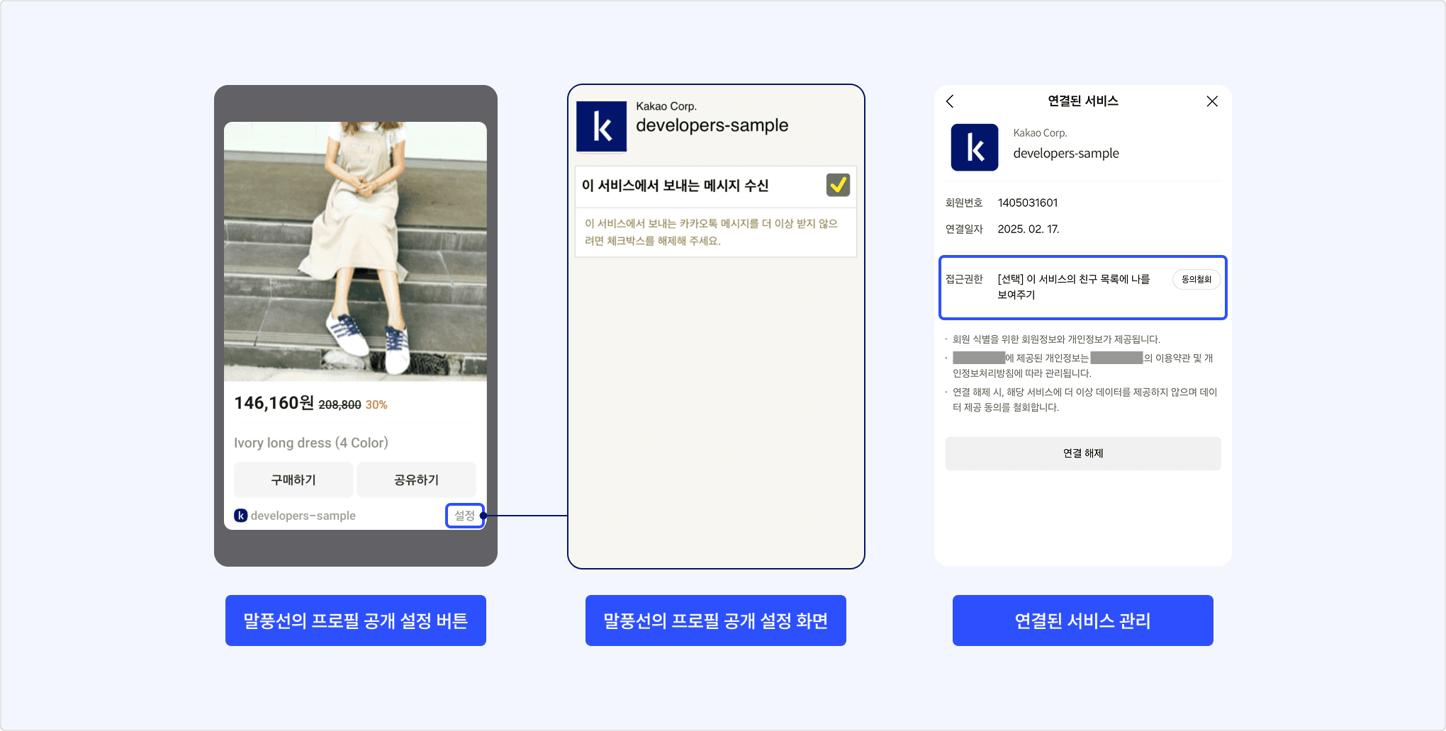 해당 설정은 수신자의 메시지 말풍선 하단 [설정] 버튼(발신자의 말풍선에는 미노출) 또는 카카오톡 [설정] > [카카오계정] > [연결된 서비스 관리]의 각 앱 정보 페이지에서 사용자가 직접 관리합니다.