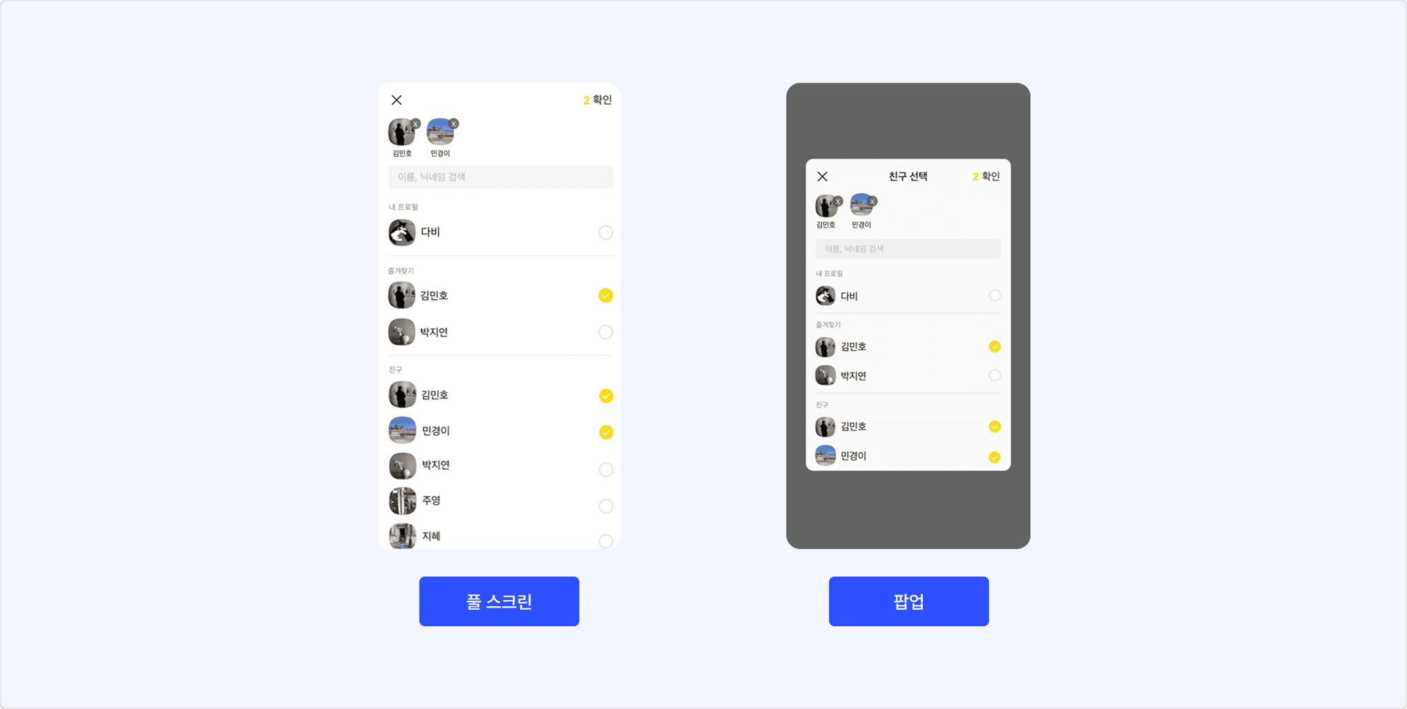 - 친구 선택 유형: 멀티 피커 또는 싱글 피커