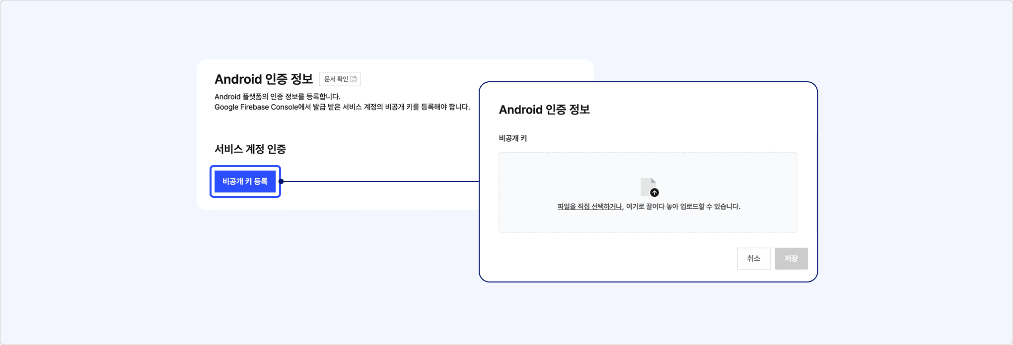 Android 플랫폼은 아래를 참고해 Google Firebase Console에서 받은 서비스 계정의 비공개 키 파일을 앱 정보에 등록해야 합니다.