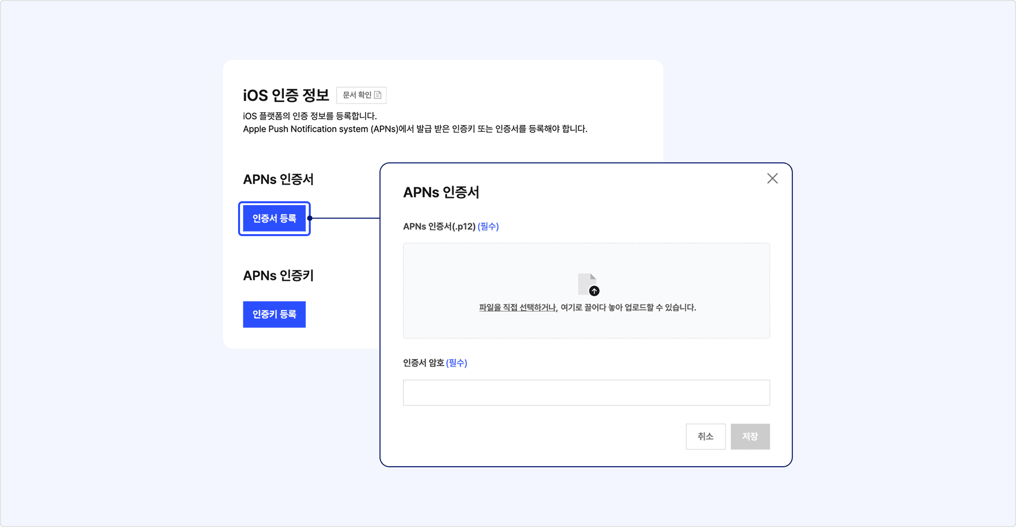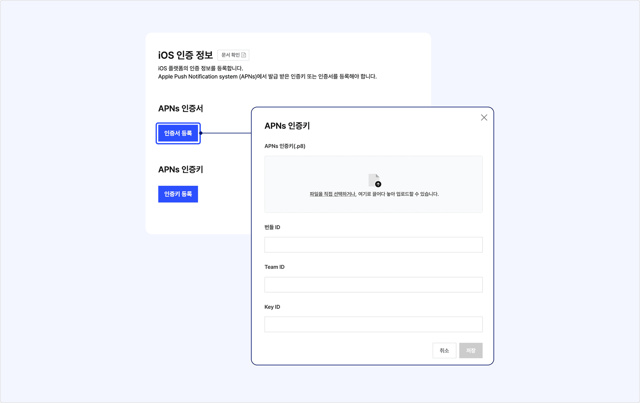 iOS 플랫폼은 아래를 참고해 Apple Push Notification system (APNs)으로 발급받은 인증키(Apple Push Notification Authentication Key, 이하 APNs 인증키)나 인증서를 앱 정보에 등록합니다.