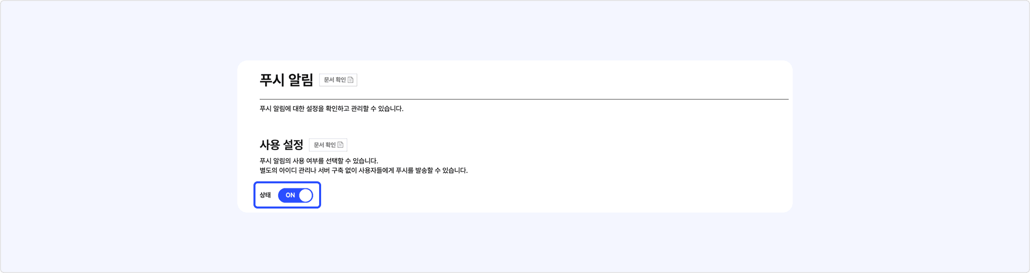 - 앱 관리 페이지의 [푸시 알림] > [사용 설정]에서 기능을 활성화합니다.