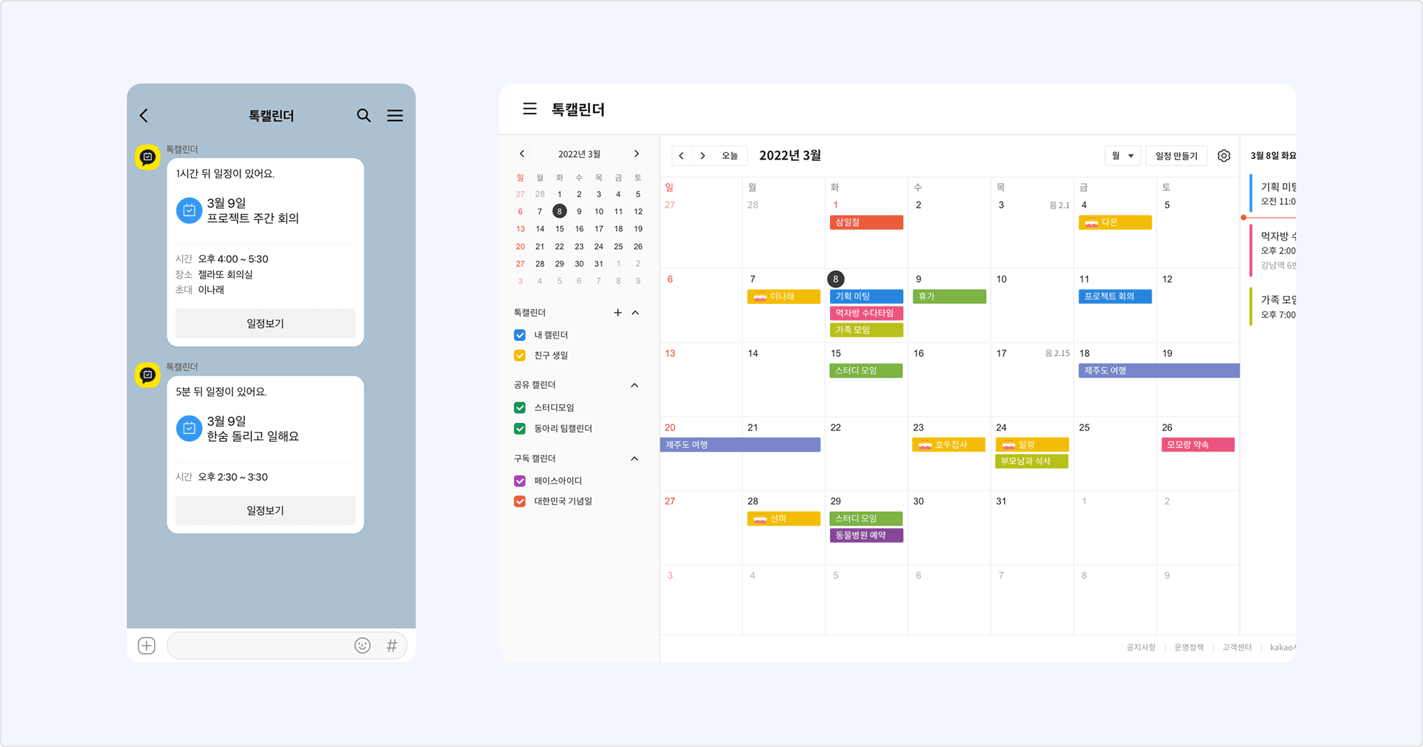 톡캘린더의 일정은 용도에 따라 구분되며, 사용 가능한 기능에 차이가 있습니다.