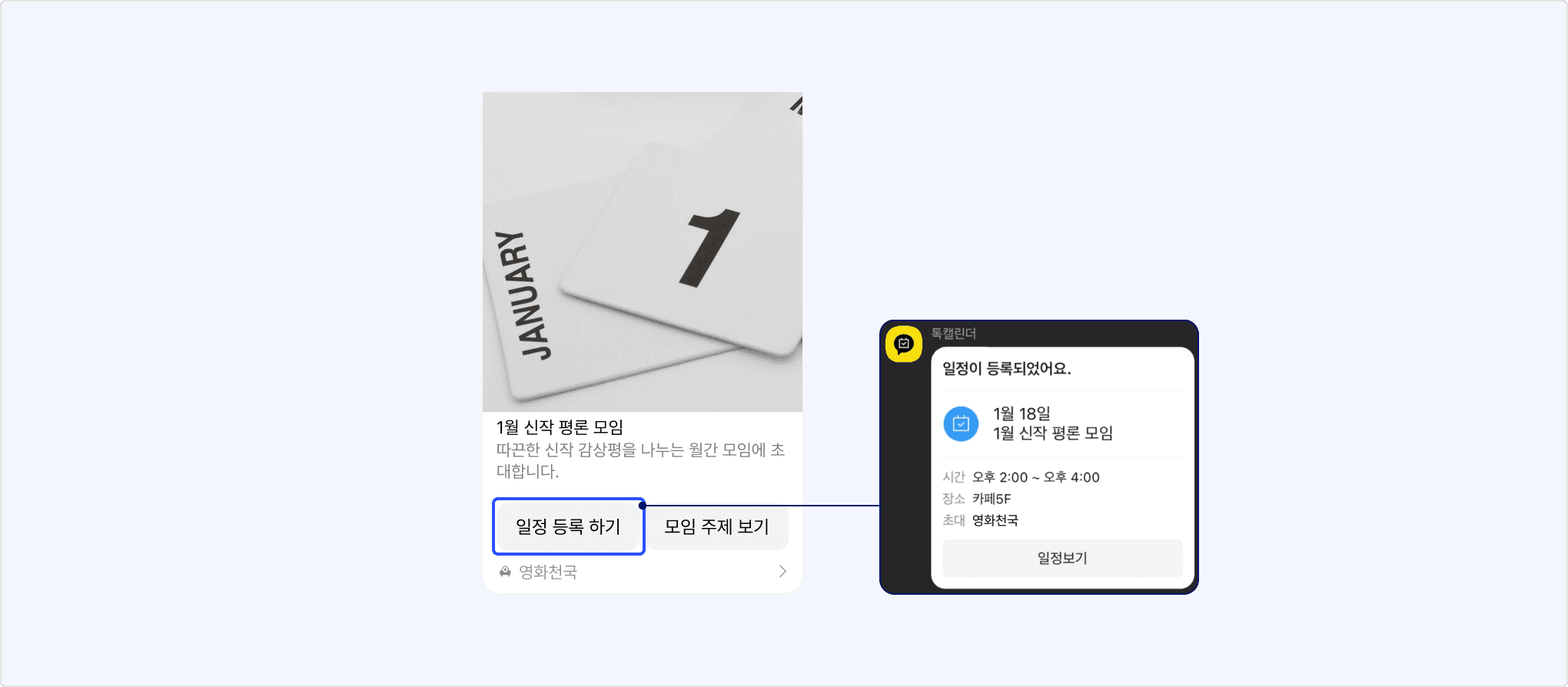 사용 권한을 받으면 서비스의 모든 사용자에게 톡캘린더 API 기능을 제공할 수 있습니다.