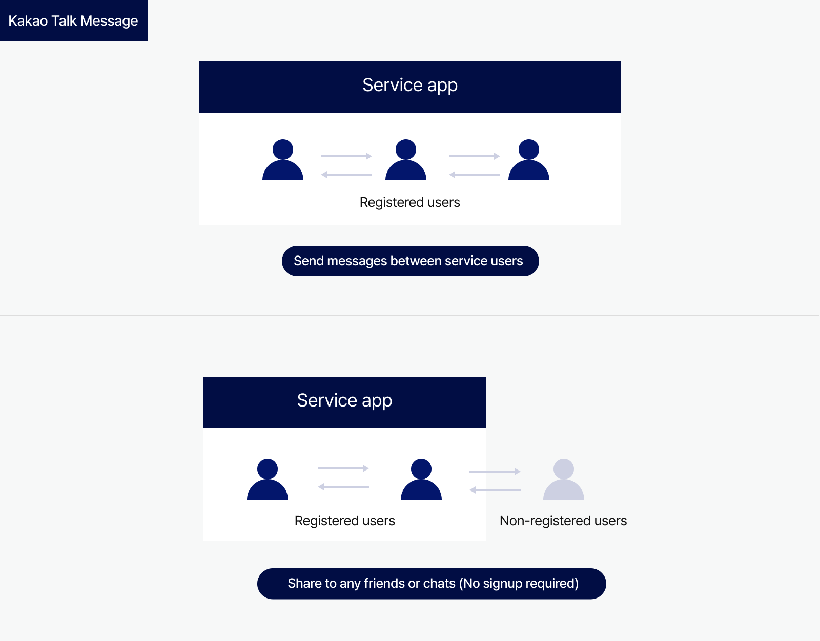 This section explains the differences between Kakao Talk Share and Kakao Talk Message, both of which are Kakao Talk Message sending features provided by Kakao Developers. Both features only support user-to-user messaging, and services cannot send messages directly to users.