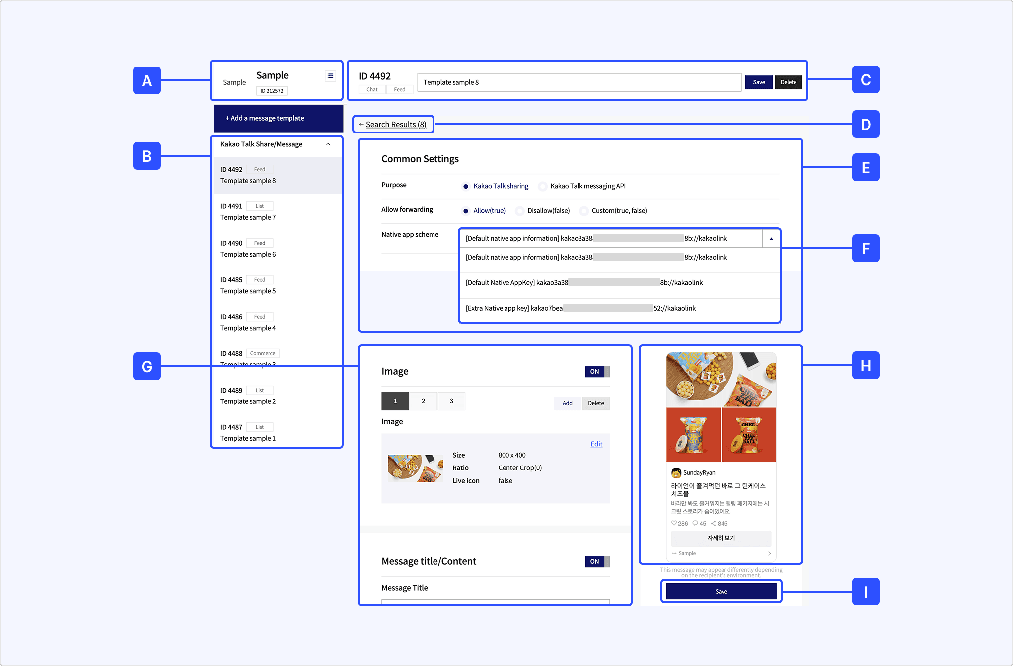 This document explains how to compose messages to send with the Kakao Talk Message API or Kakao Talk Share API as custom templates by using the Message Template Builder. For the details on each item, see Concepts.