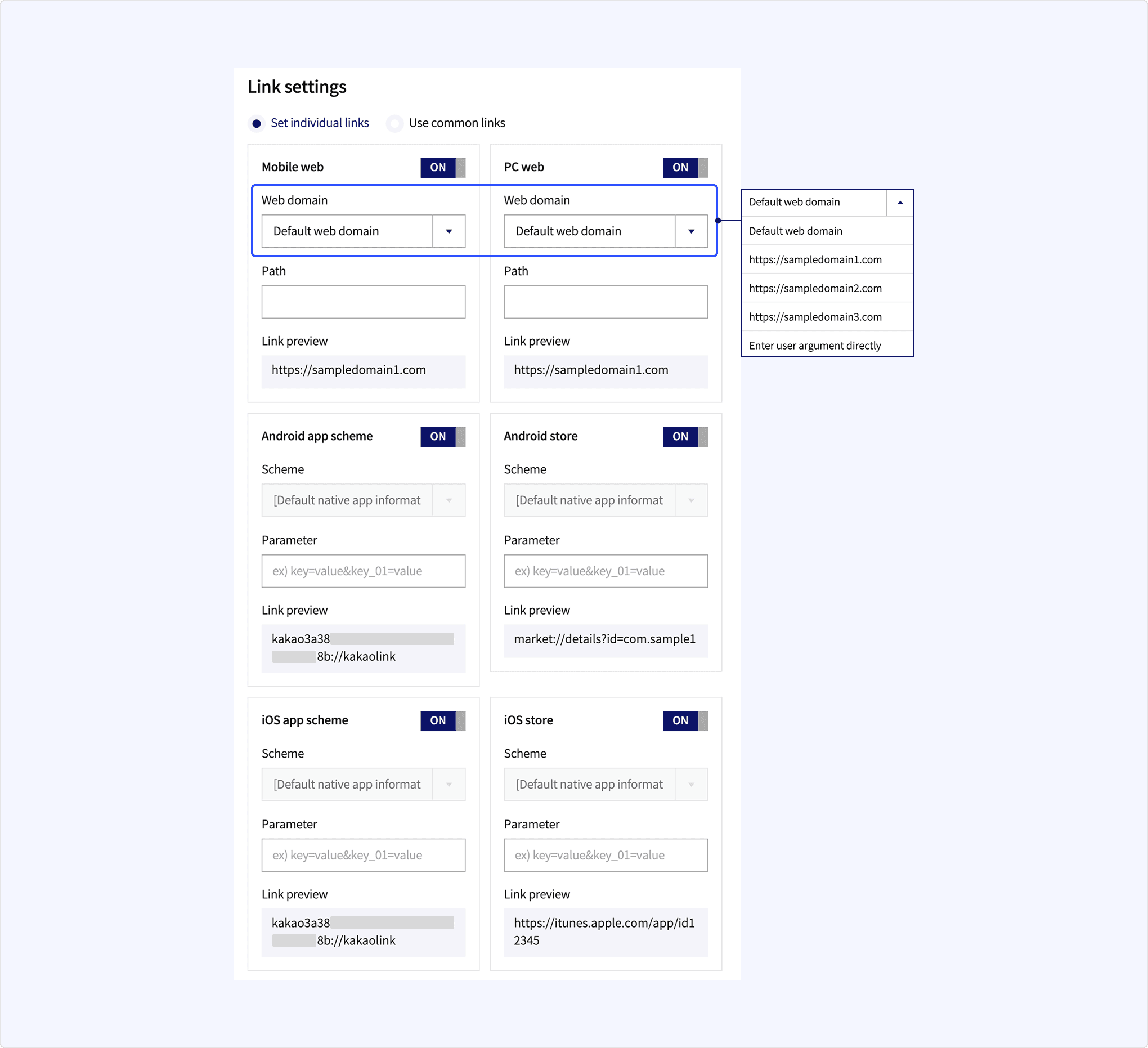 | PC web | Applies when the recipient’s environment is PC. Configuration items are the same as [Mobile web]. Caution: When selecting the [Default web domain], the value is reflected as the Default web domain in [App] > [Product Link] on the app management page, and if the Default web domain is changed, the configured [Web domain] value also changes together. Important: The Web domains in [App] > [Product Link] on the app management page must be registered to configure this. |