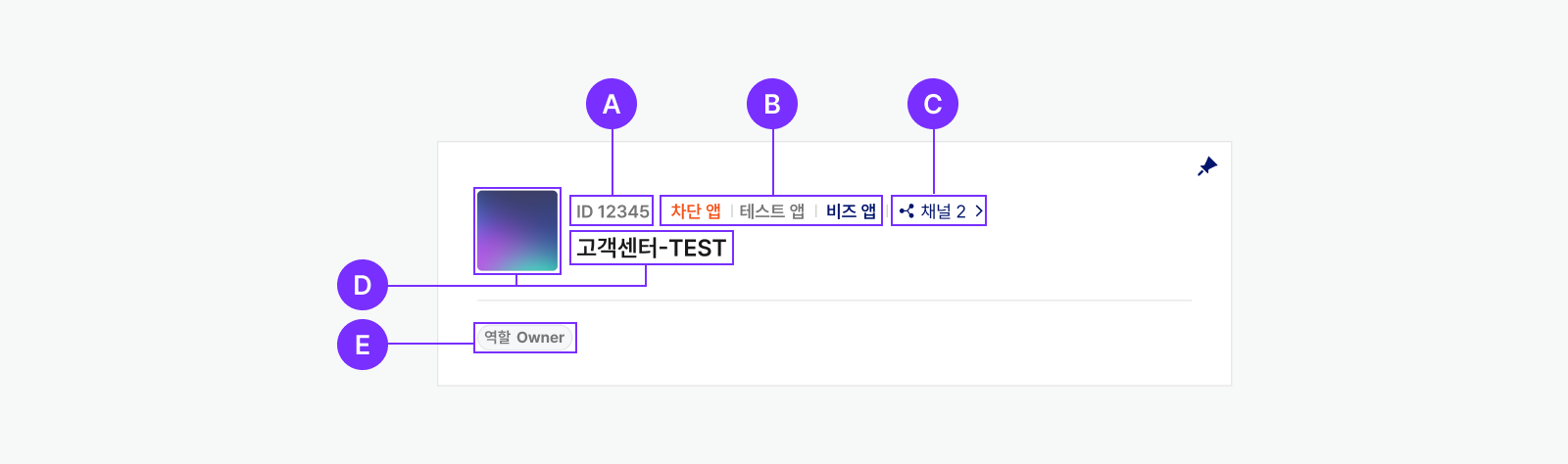 🅐 앱 ID 🅑 앱 분류 🅒 연결된 카카오톡 채널 개수 🅓 앱 생성 시 등록한 앱 이름과 앱 아이콘 🅔 멤버 역할