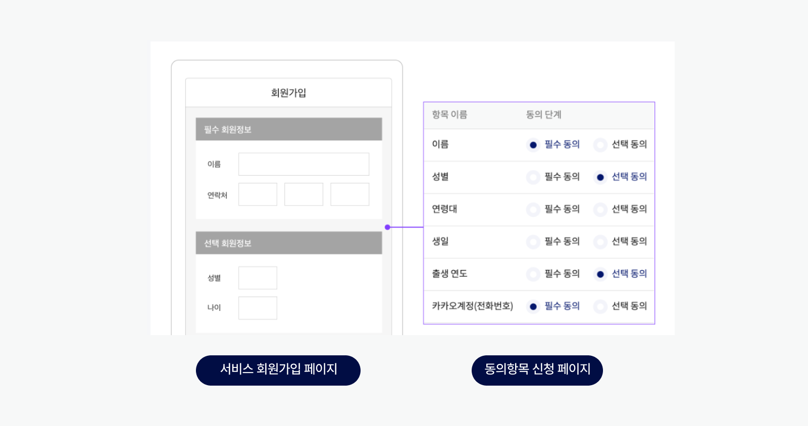 서비스의 정보 조회 또는 기능 사용을 위한 동의항목을 설정할 수 있습니다. 아래 단계별 안내를 참고합니다.